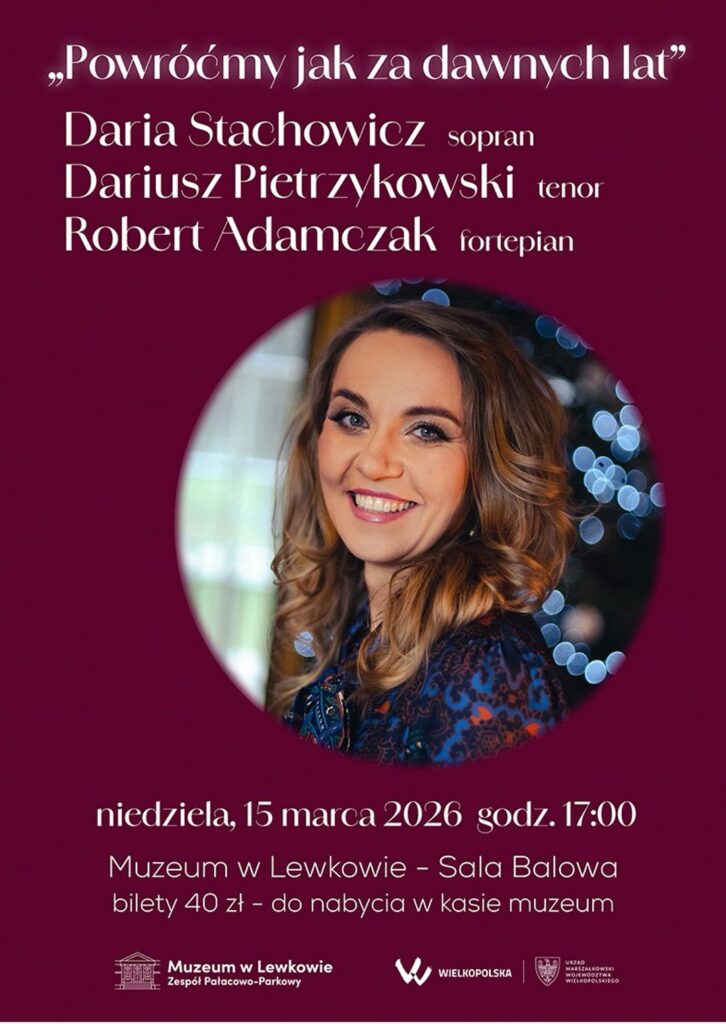 Muzeum w Lewkowie Zespół Pałacowo-Parkowy zaprasza na wyjątkowy koncert pt. „Powróćmy jak za dawnych lat”. Odbędzie się w niedzielę 15 marca 2026r. o godz. 17.00.